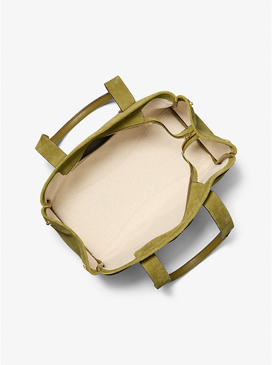 The Michael Kors Romee Large Suede Tote Bag combines spacious practicality with sophisticated style. Crafted from 100% soft suede sourced from environmentally certified tanneries, this tote features a secure zip closure and sturdy top handles for comfortable carrying. Its gold-tone MK charm adds a refined touch, while the front snap pocket and interior slip pocket offer organised storage. Measuring 9"W x 9.5"H x 15.25"D with a 10" handle drop, it's perfect for daily use or weekend travel. The blended fabric lining ensures durability and a polished finish.