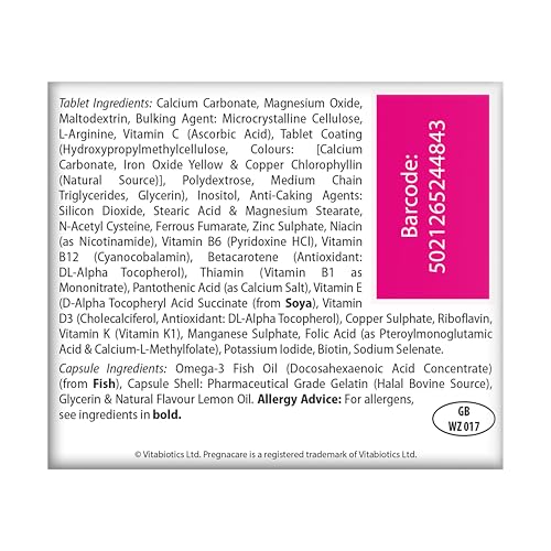 [Calcium (Natural Source)], Polydextrose, Medium (Hydroxypropylmethylcellulose, B12 Betacarotene DL-Alpha Tocopherol), Thiamin (Vitamin (Cyanocobalamin), Calcium Carbonate, Magnesium Oxide, Maltodextrin, Bulking Agent: Microcrystalline Cellulose, L-Arginine, Vitamin C (Ascorbic Acid), Tablet Coating Colours: Carbonate, Iron Oxide Yellow & Copper Chlorophyllin Chain Triglycerides, Glycerin), Inositol, Anti-Caking Agents: Silicon Dioxide, Stearic Acid & Magnesium Stearate, N-Acetyl Cysteine, Ferrous Fumarate, Zinc Sulphate, Niacin (as Nicotinamide), Vitamin B6 (Pyridoxine HCI), Vitamin (Antioxidant: B1 Mononitrate), Pantothenic Acid (as Calcium Salt), Vitamin E (D-Alpha Tocopheryl Acid Succinate (from Soya), Vitamin D3 (Cholecalciferol, Antioxidant: DL-Alpha Tocopherol), Copper Sulphate, Riboflavin, Vitamin K (Vitamin K1), Manganese Sulphate, Folic Acid (as Pteroylmonoglutamic Acid & Calcium-L-Methylfolate), Potassium lodide, Biotin, Sodium Selenate. Capsule Ingredients: Omega-3 Fish Oil (Docosahexaenoic Acid Concentrate) (from Fish), Capsule Shell: Pharmaceutical Grade Gelatin (Halal Bovine Source), Glycerin & Natural Flavour Lemon Oil.